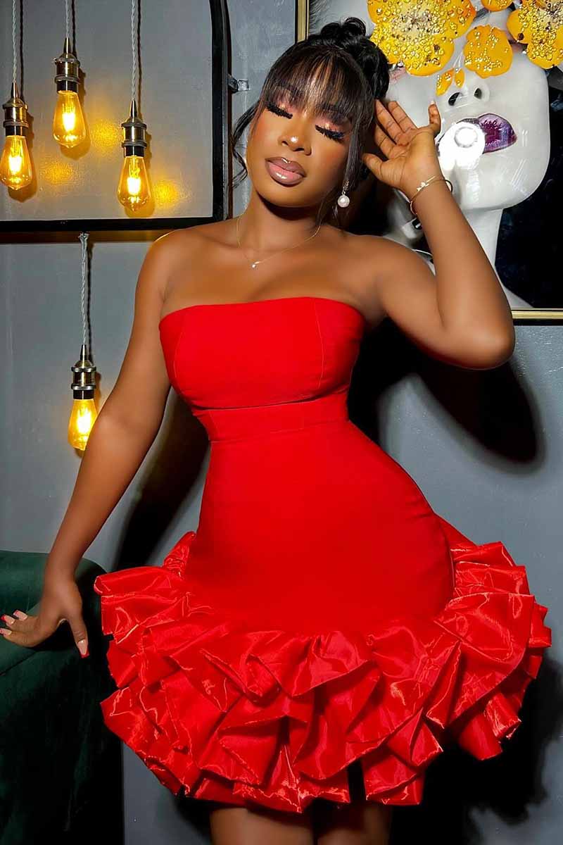Strapless Boat Neck Ruffle Hem Bodycon Party Mini Dresses-Red
