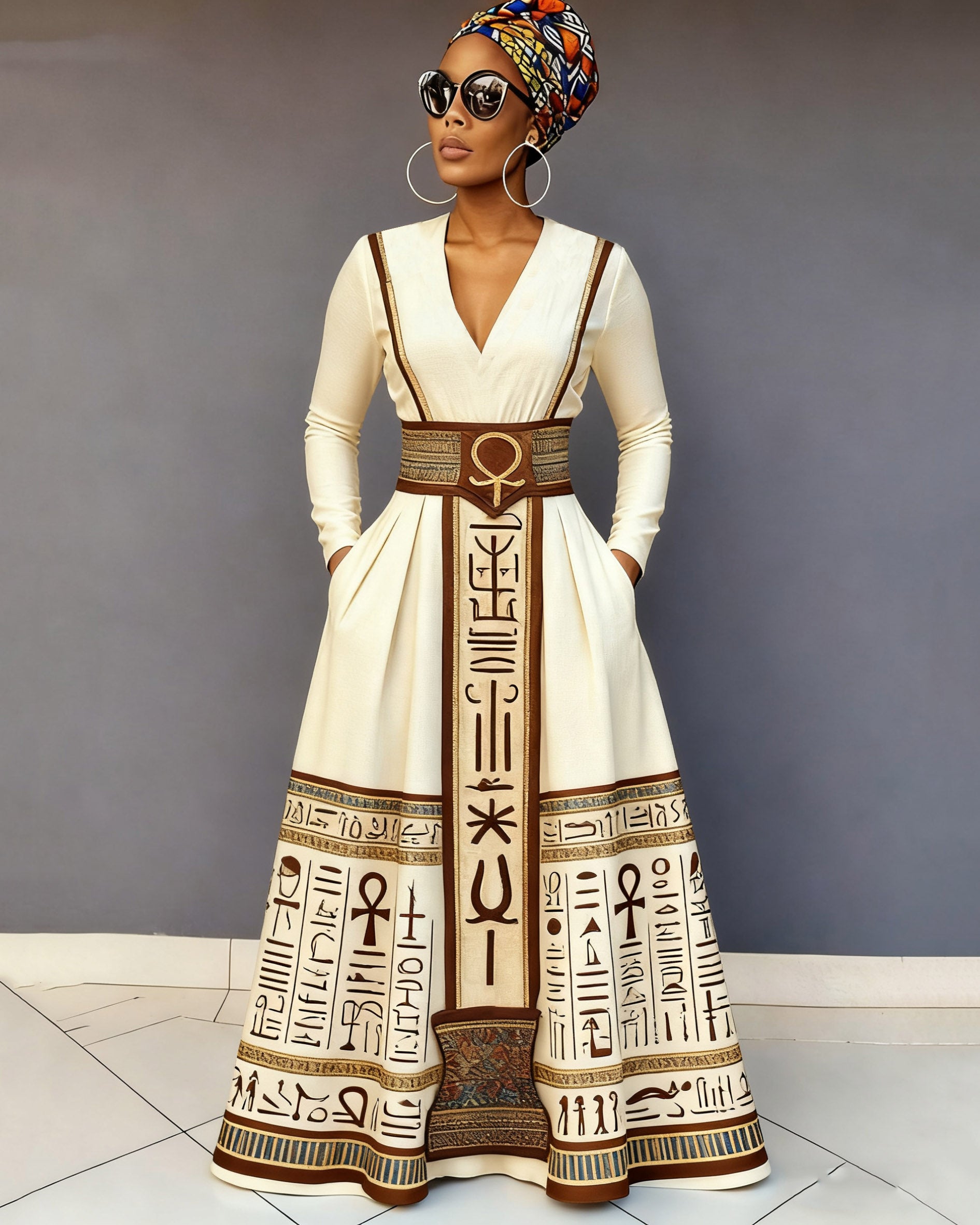 Ancient Egyptian Anka Geometric Long Sleeve V-Neck Maxi Dress