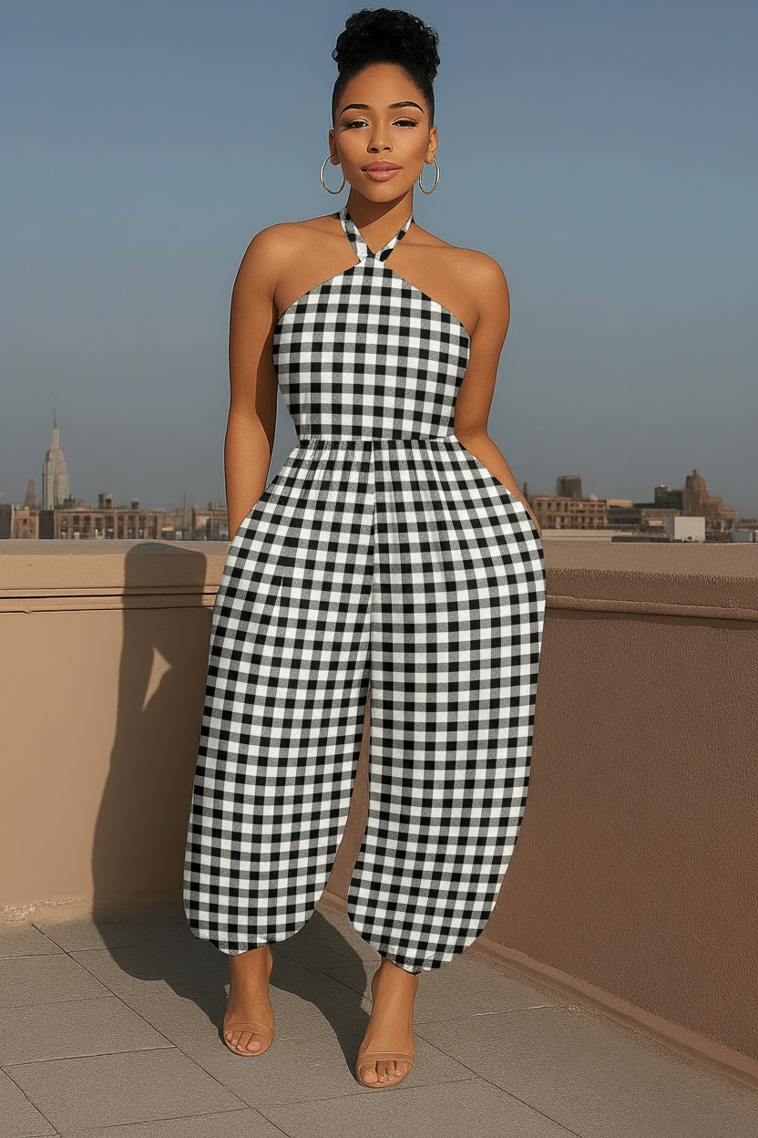Black White Checkered Halter Neck Jumpsuit