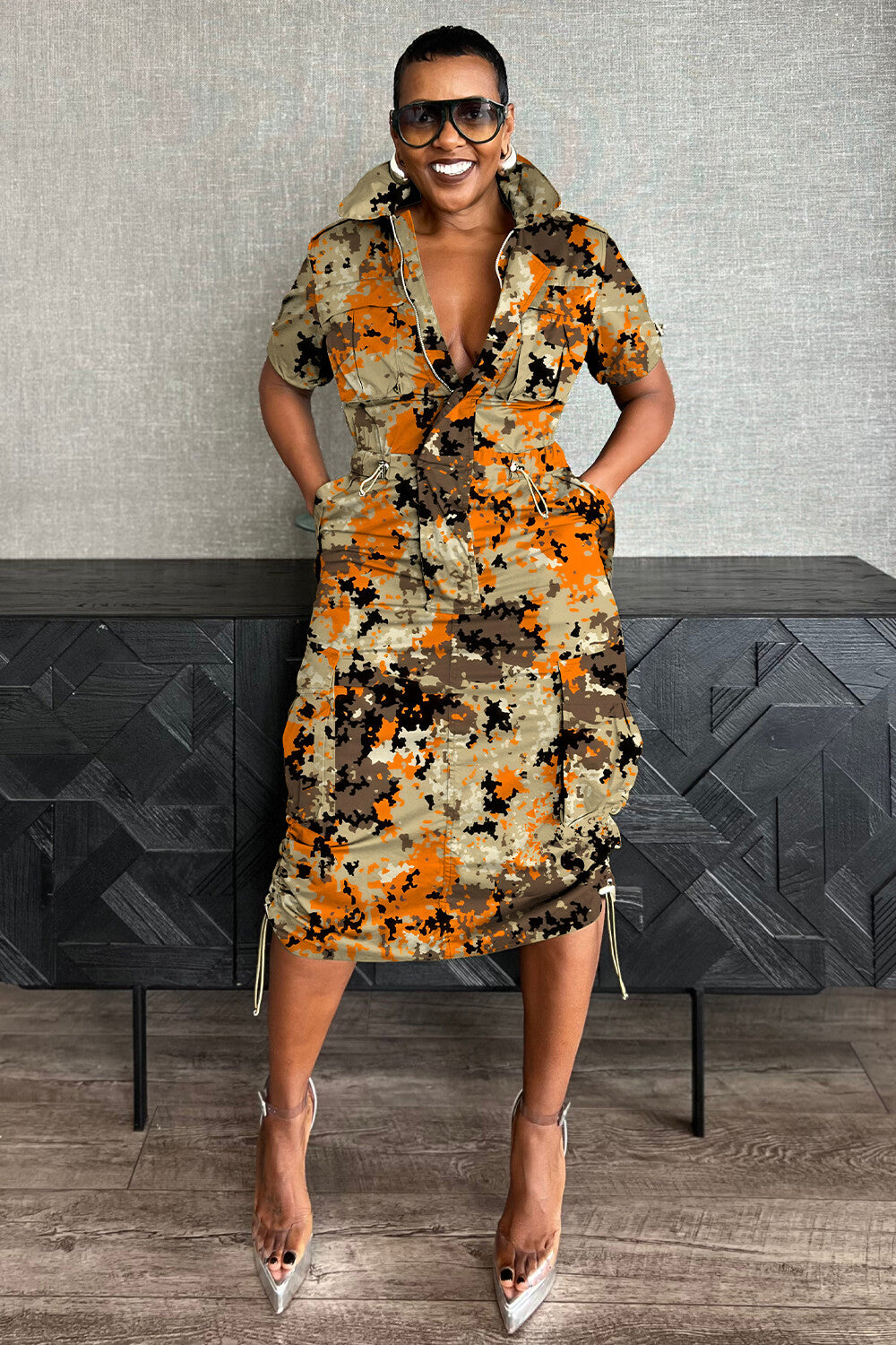Camo Print Zip-Up Cargo Pocket Ruched Daily Midi Dresses-Khaki [Pre Order]