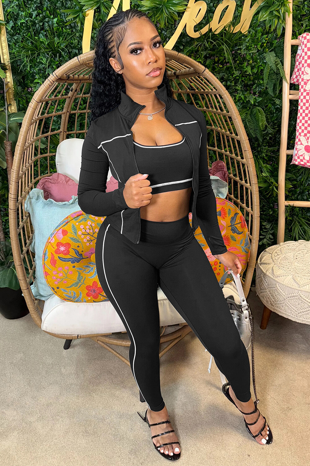 Colorblock Trim Track Jacket Crop Tank Top Leggings Casual 3pcs Set-Black