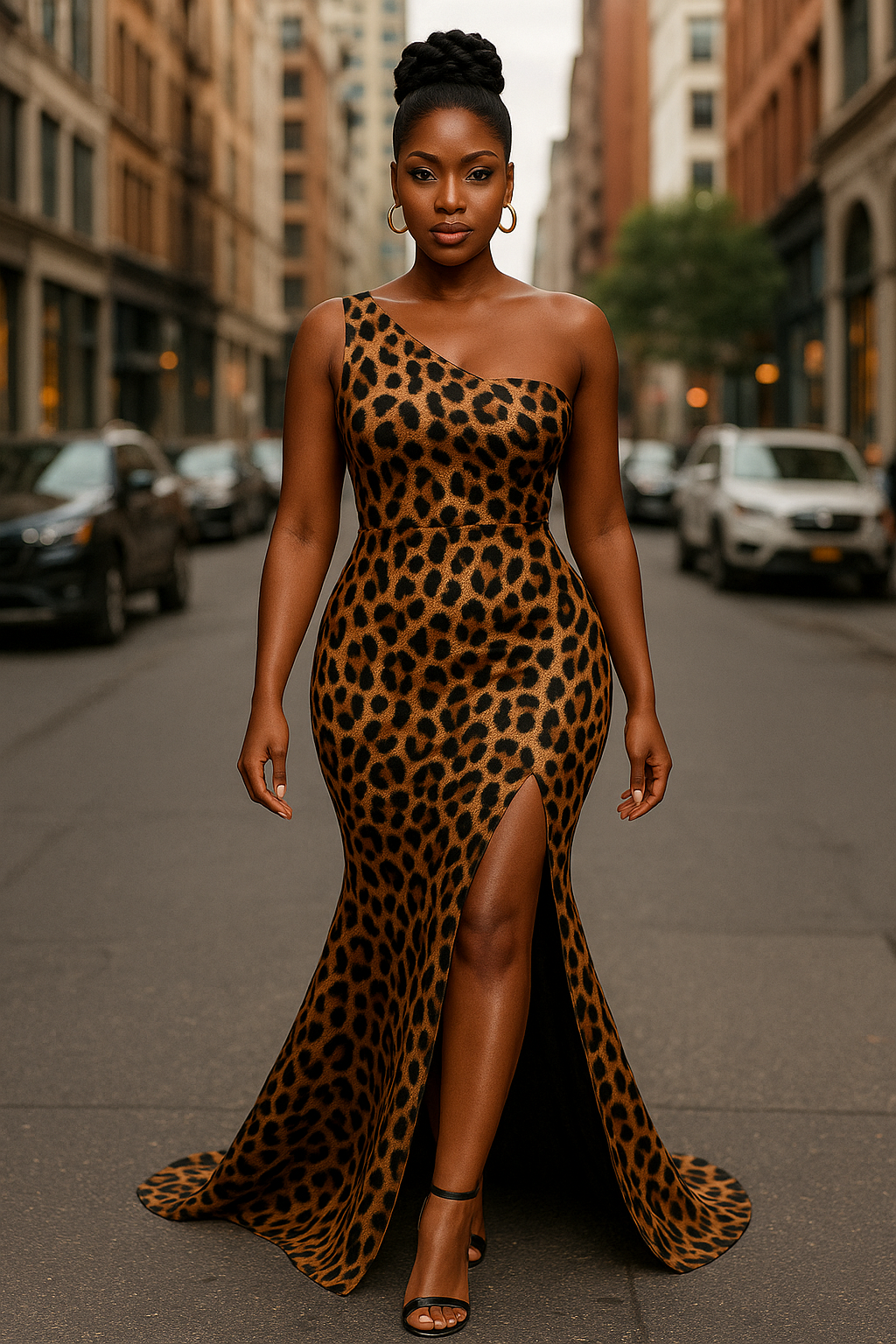 Elegant Oblique Shoulder Leopard Print Girdle Sheath Split Dress