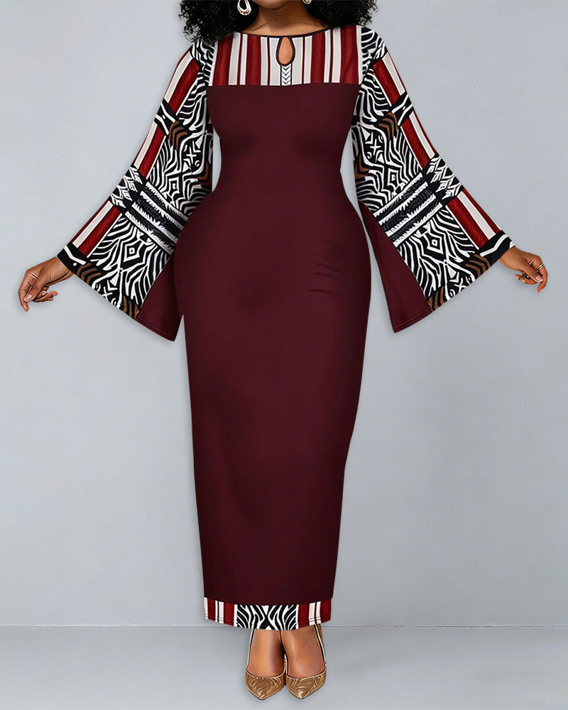 Geometric Totem Splicing Round Neck Bell Sleeve Bodycon Long Dress