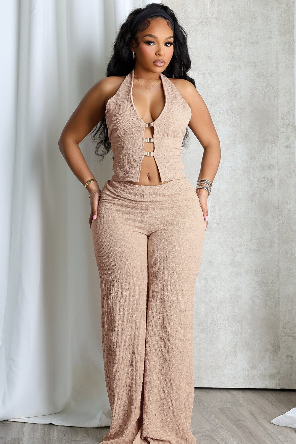Halter Plunge Neck Single-Breasted Crop Top Wide Leg Pants 2pcs Set-Khaki