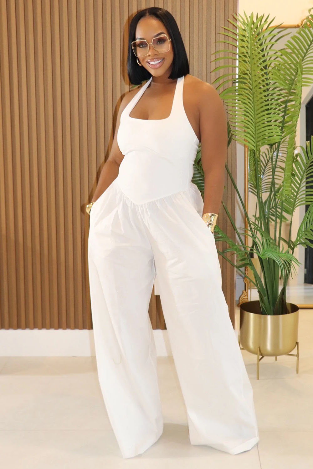 Halter Square Neck Backless Top Wide Leg Pants 2pcs Set-White [Pre Order]