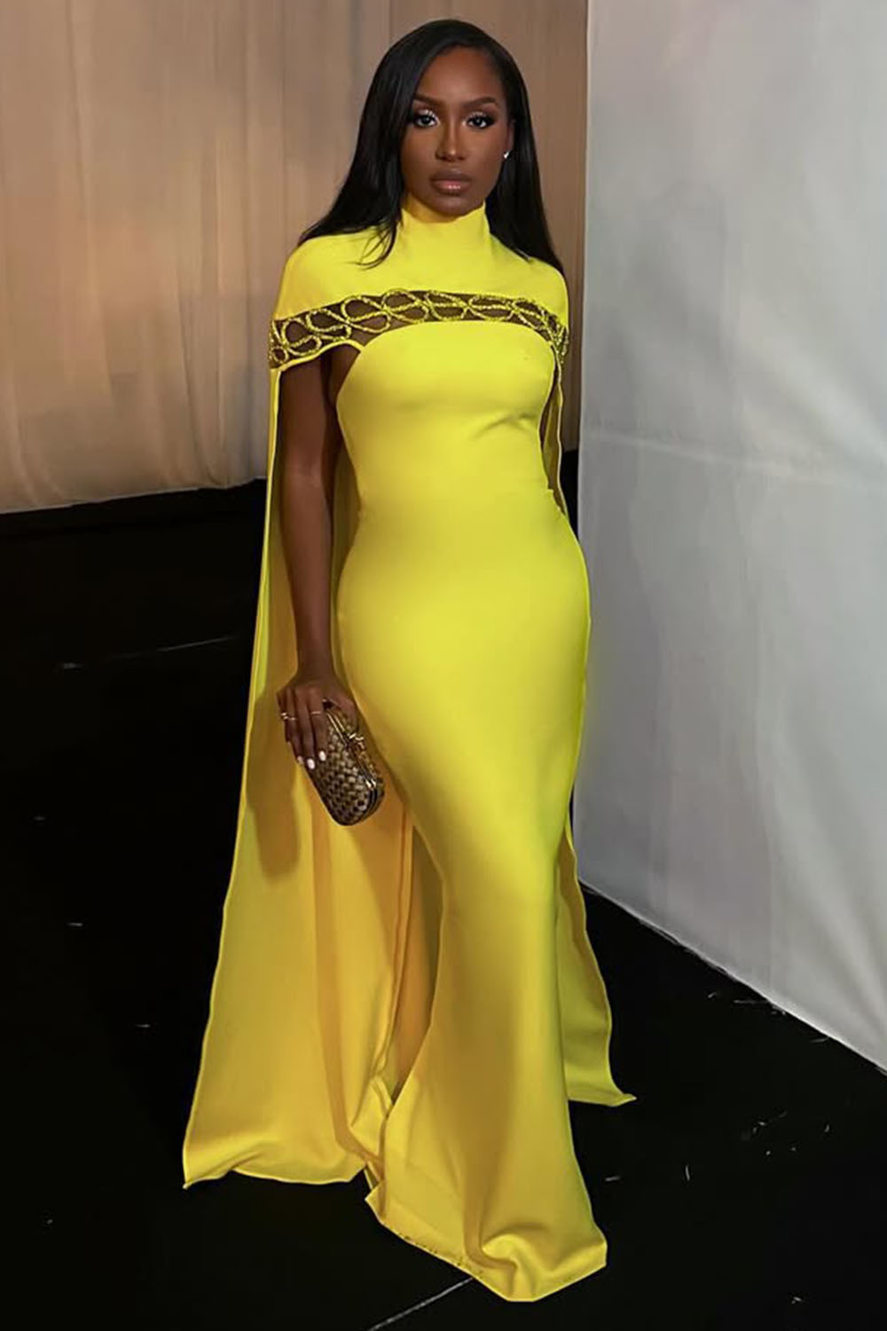 High Neck Cutout Slim-Fit Formal Party Maxi Cape Dresses-Yellow [Pre Order]