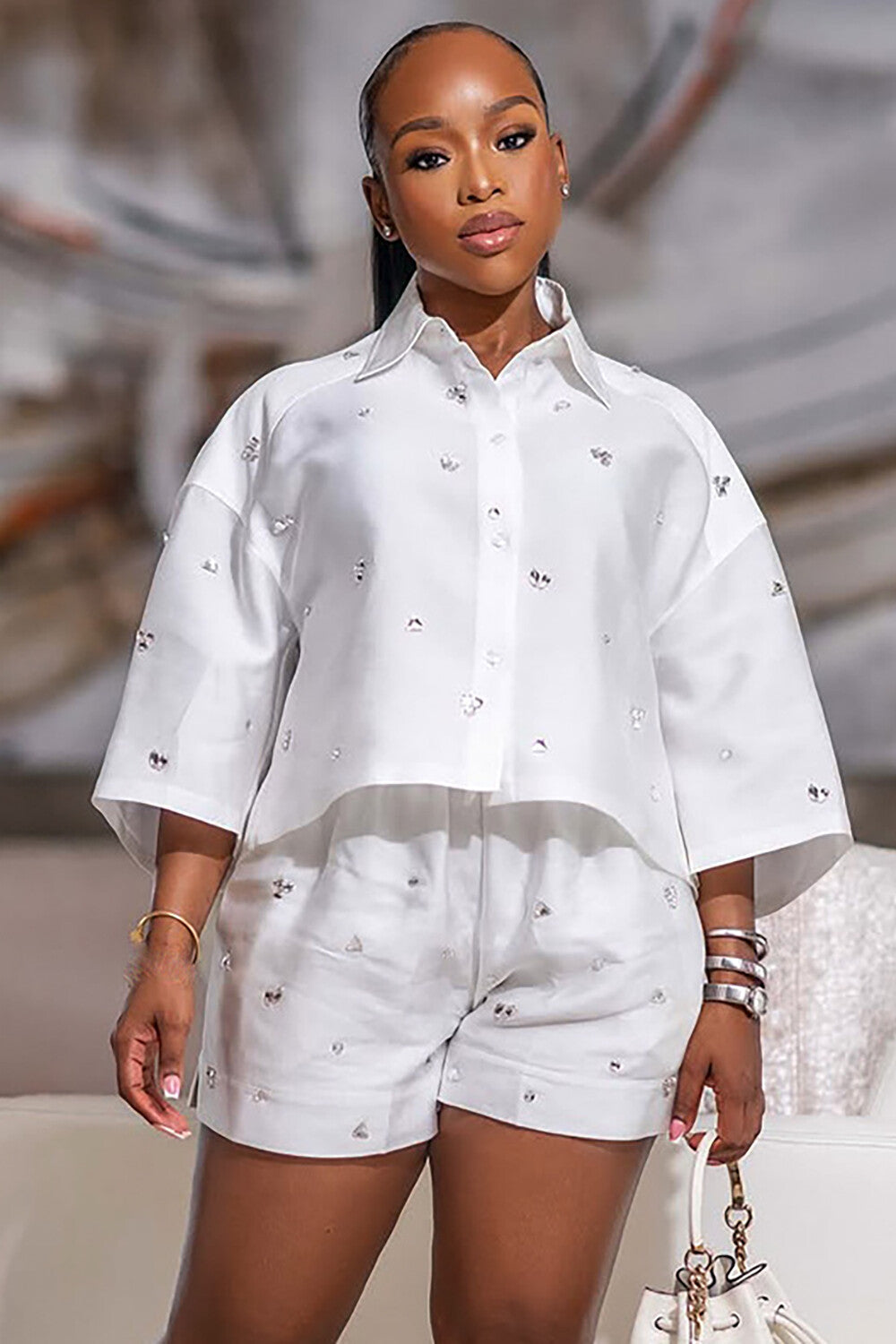 Rhinestone Decor Turndown Collar Crop Blouse Shorts 2pcs Set-White