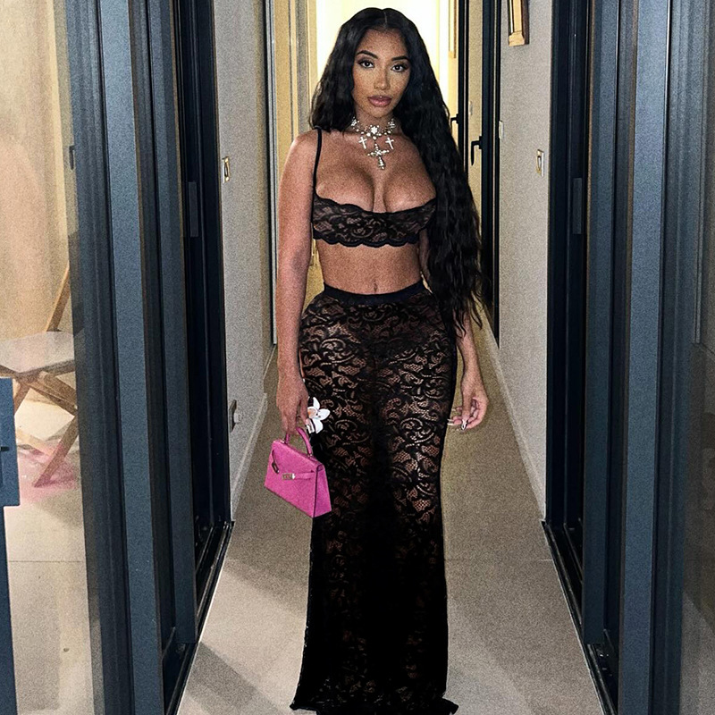 Sexy Cutout Sling Top Solid Color High Waist Skirt Lace Two Piece Suit [In Stock]