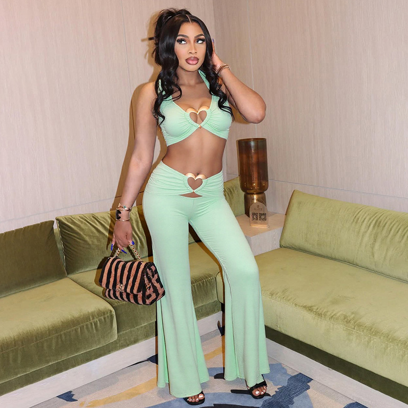 Sexy Hot Girl Love Metal Buckle Hollow Top Wide-Leg Casual Pants Two Piece Set [In Stock]