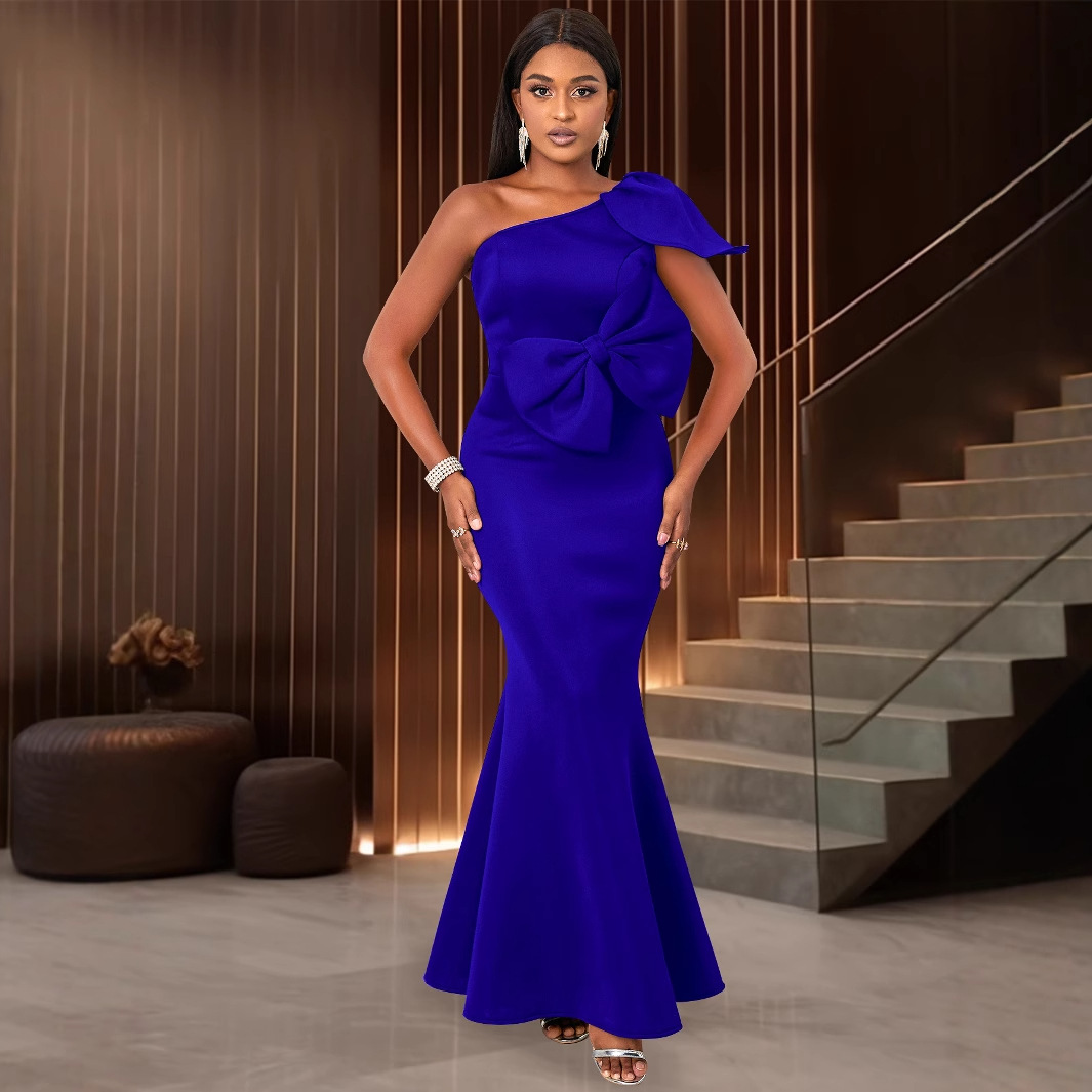 Sexy One-Shoulder Dress Ruffle Sleeve Bow Slim Party Fishtail Dress Party Dress