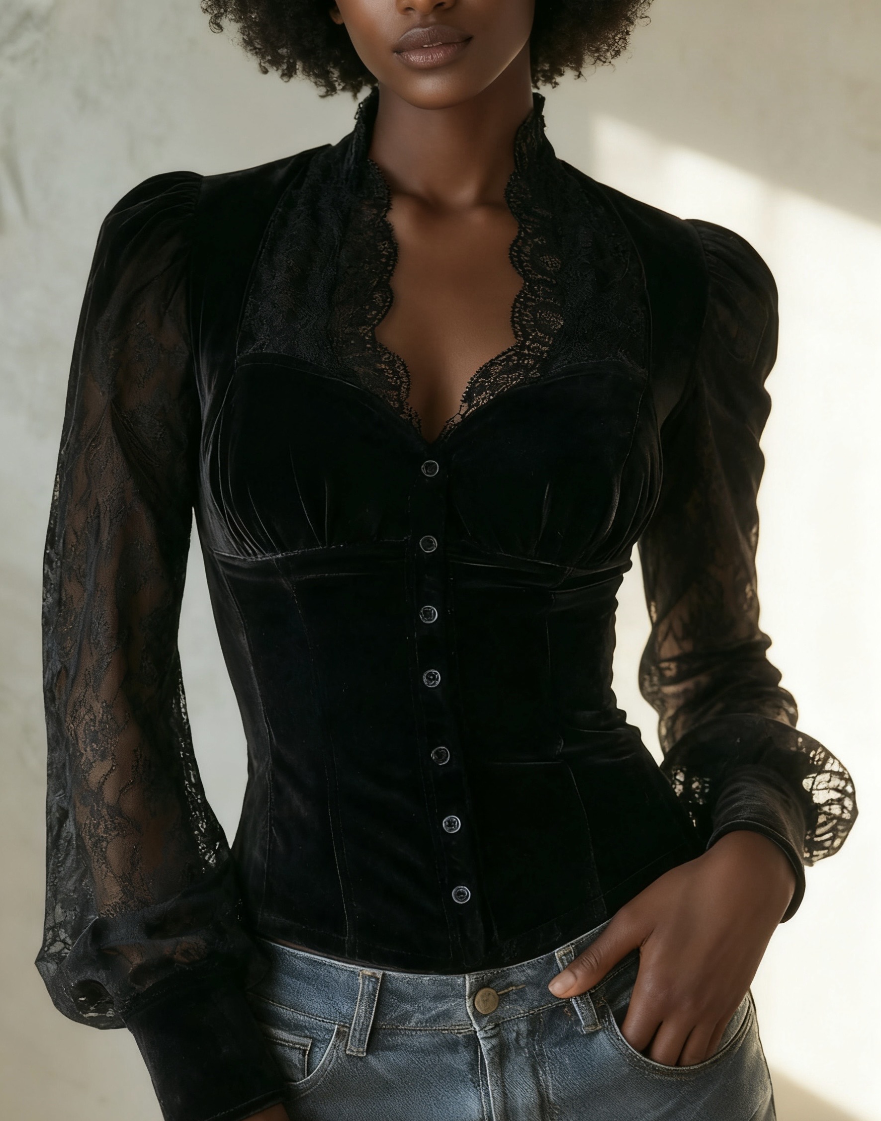 Sexy V-neck Lace Stitching Long-Sleeved Shirt Chic Temperament Top
