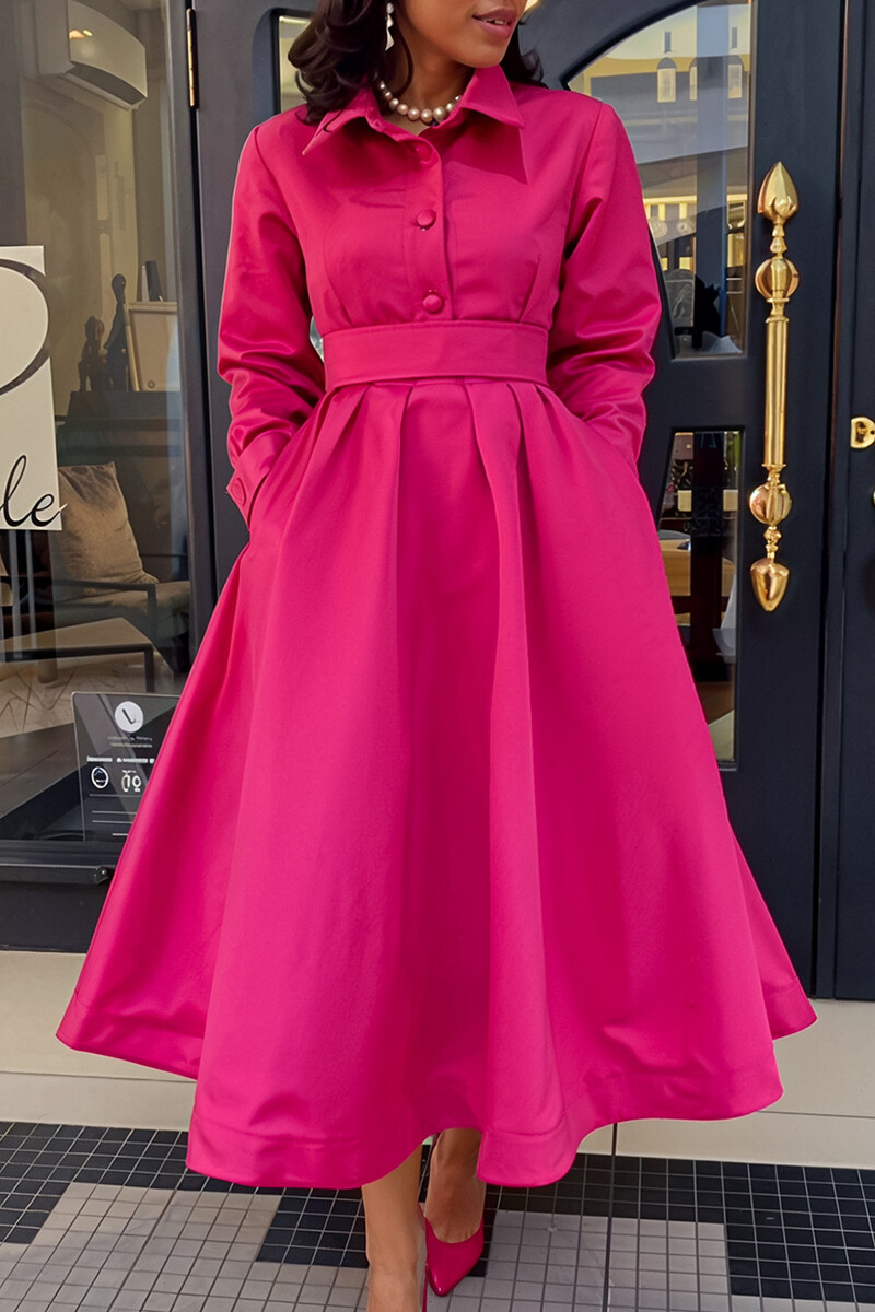 Turndown Collar Long Sleeve Cinch Waist Plain Midi Shirt Dresses-Fuchsia