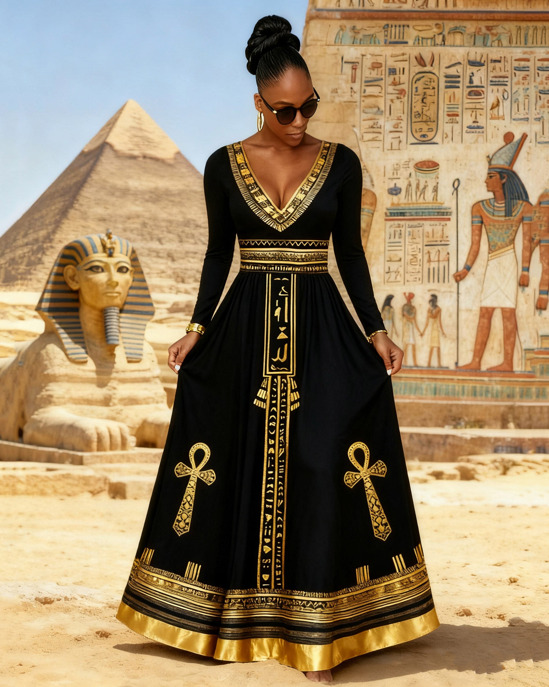 V Neck Black Culture Egyptian Cross Long Sleeves Maxi Dress