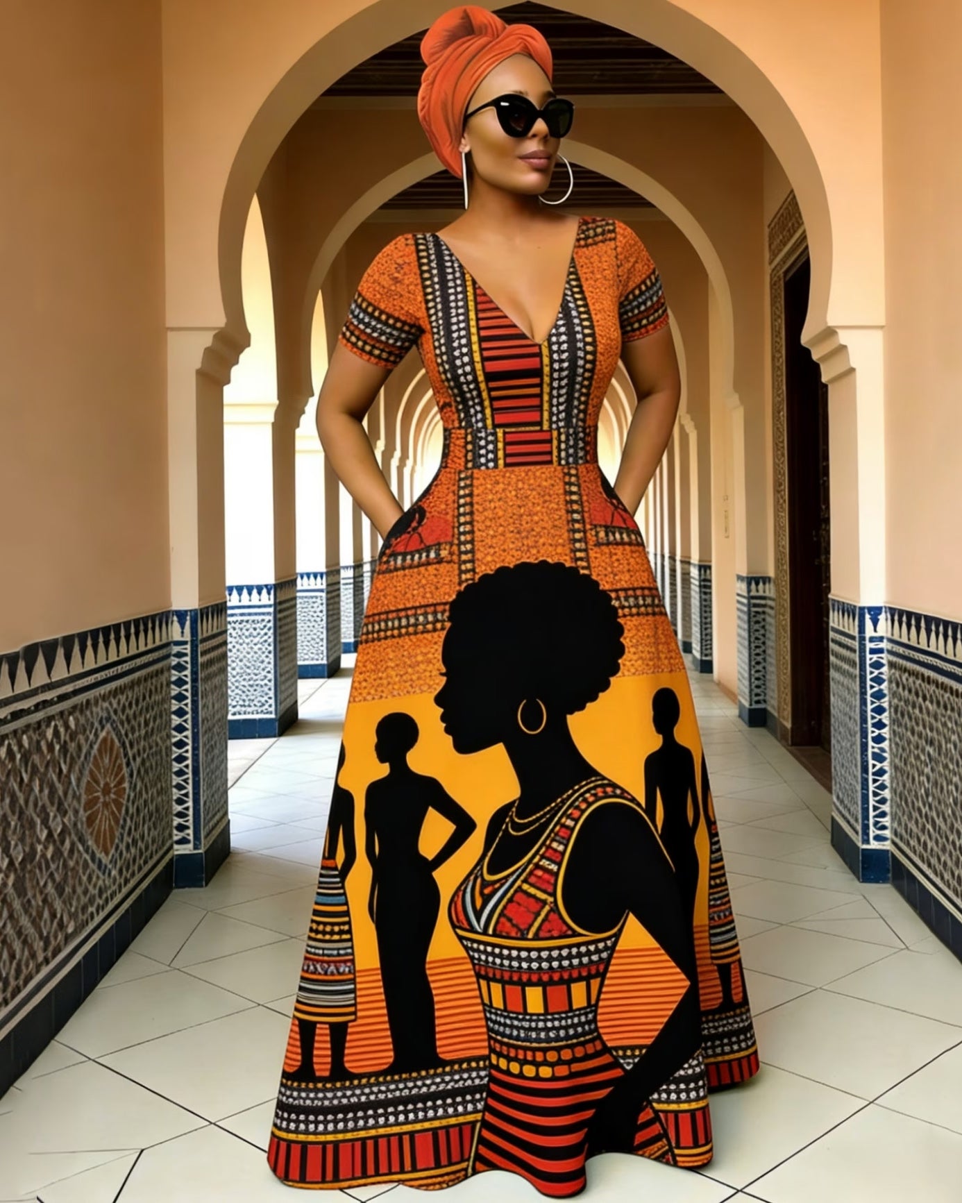 V Neck Black Women Tribal Totem Short Sleeves Pocket Maxi Dress