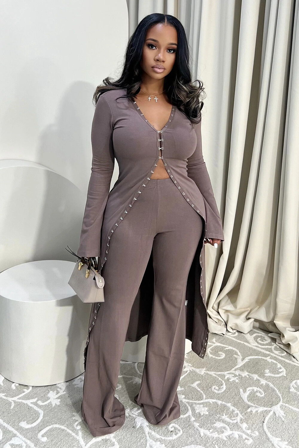 V Neck Button Up Long Sleeve Top High Waist Pants Set-RosyBrown [Pre Order]