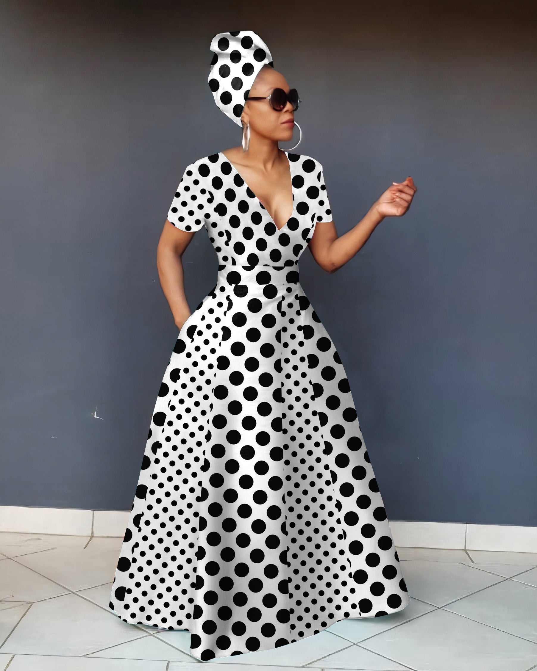 V Neck Polka Dot Stitching Casual Short Sleeve Maxi Dress