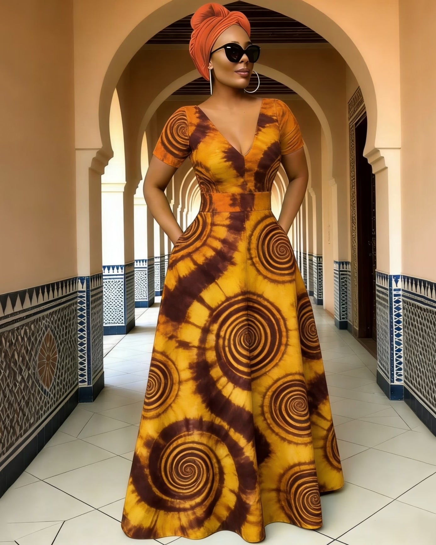 V Neck Tie-dye Spiral Print Short Sleeves Pocket Maxi Dress