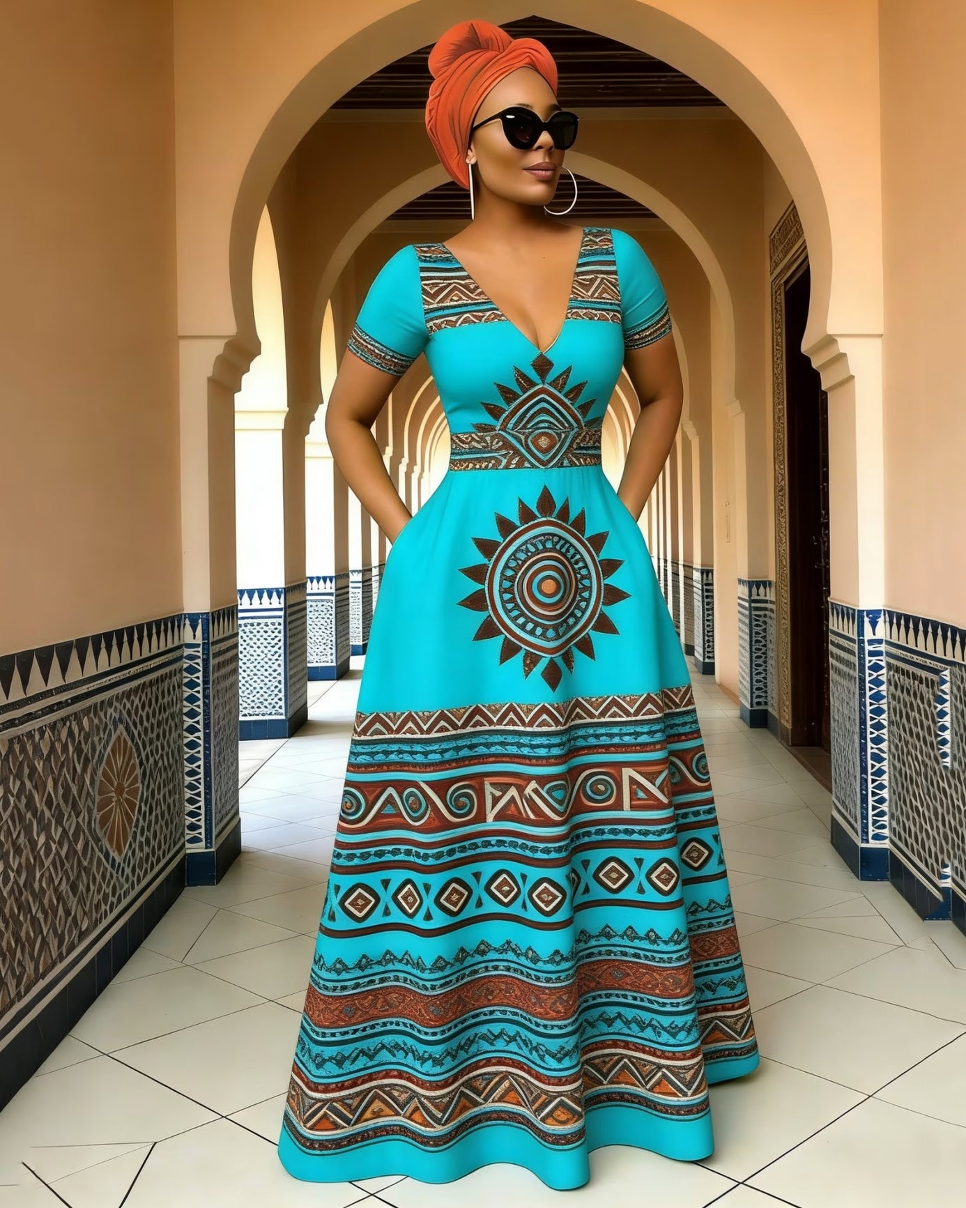 V Neck Tribal Totem Sun Geometry Short Sleeves Pocket Maxi Dress