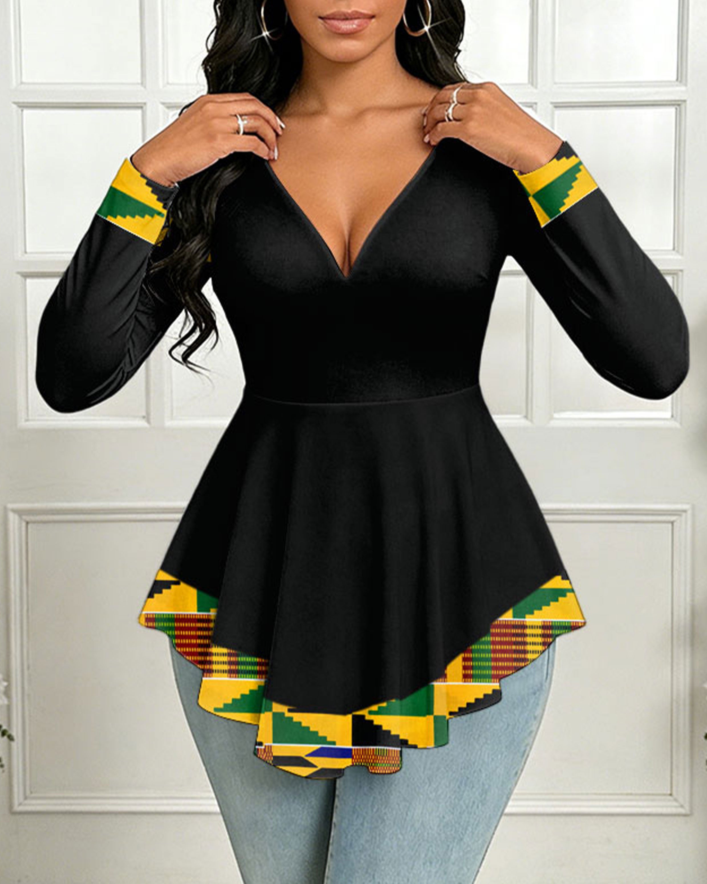 V-Neck Women African Reggae Pattern Black Stretch Round Neck Ruffled Top