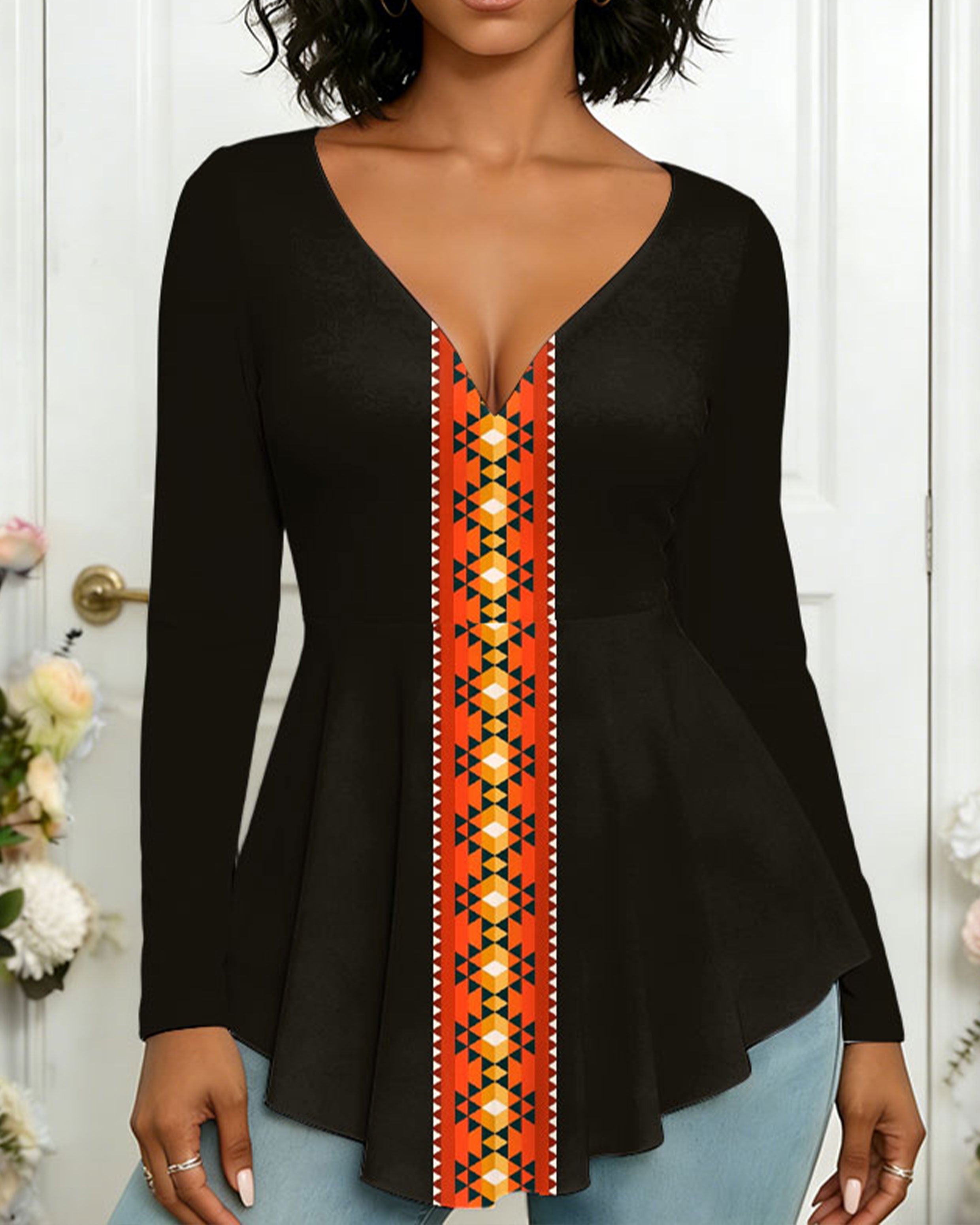 Women's V-neck African Fabric Geometric Patchwork Black Elastic Round Neck Ruffled Top